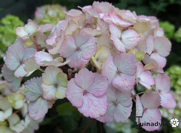 Ze verkleuren naar wit tot zalmroze en later dieproze tot wijnrood. Deze soort verkleurt niet naar blauw op zure grond.