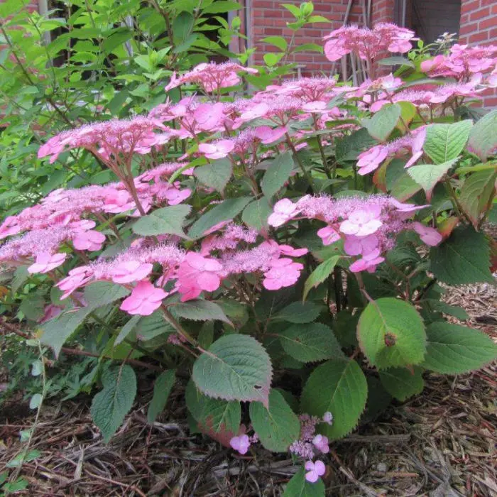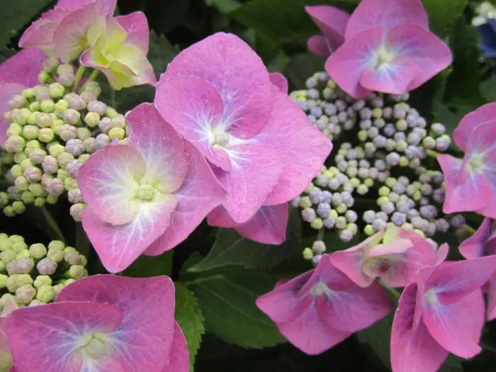 Hydrangea serrata Veerle is een schermbloemige hortensia met azuurblauwe steriele bloemen (of roze naargelang de zuurtegraad van de grond) en rozepaars tot lichtviolette fertiele randbloempjes.
