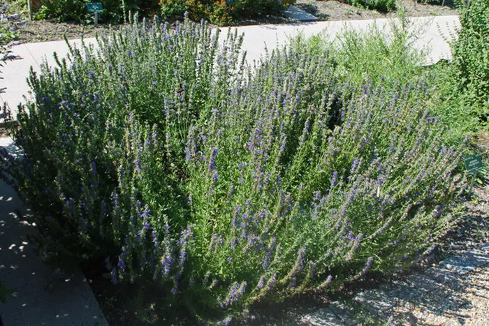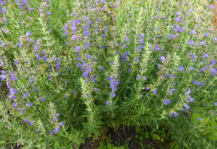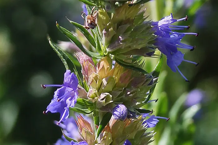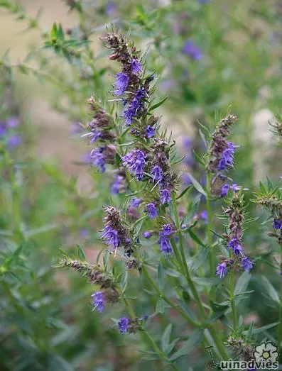 Hyssop is een aromatische plant van 50cm met smalle blaadjes en blauwe bloemen, ook wit en roze komt voor.