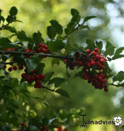 Wordt gewaardeerd om zijn groenblijvende, glanzende donkergroene bladeren met stekelige golvende randen en zijn rode besjes in de winter. Oudere bladeren zijn minder stekelig.