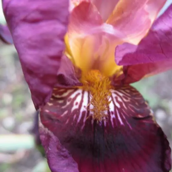 Iris germanica 'Senlac' bloeit met lilapaarse petalen en donker wijnrode sepalen met een goudgele baard.