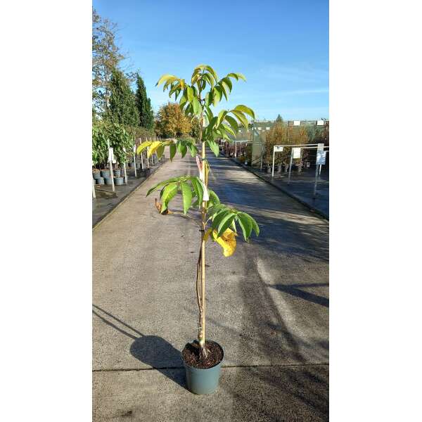De vruchten zijn glad en groen, 4 tot 5 cm groot en bevatten een heerlijke eetbare walnoot. Ze zijn eetbaar vanaf oktober.