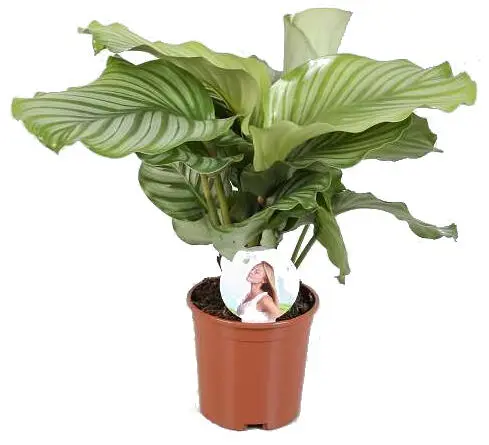 Het is een luchtzuiverende plant met grote bladeren en opvallende nerven in verschillende groene tinten.