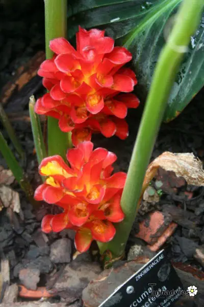 Curcuma rubrobracteata (bv. 'Fire' of 'Red Fireball') bloeit roodgeel of goudgeel.