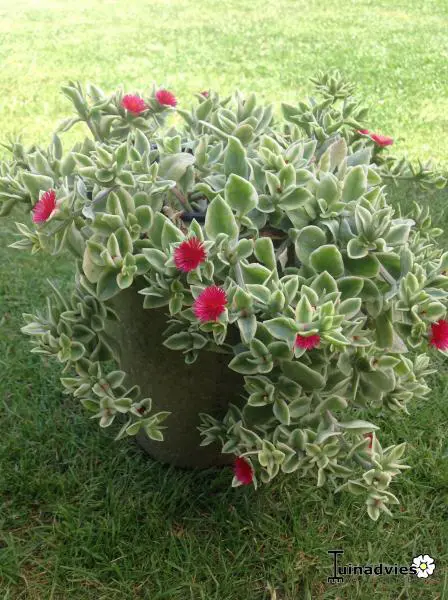 Dorotheanthus bellidiformis 'Mezoo Trailing Red' is afkomstig uit Z-Afrika. Heeft een hangende groeiwijze met succulente (ivoor)witbont gekleurd blad en rode bloemen.