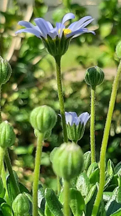 De madeliefachtige bloemen zijn hemelsblauw met een geel hartje.
