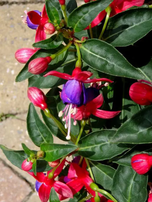 Fuchsia 'BELLA Vera' uit de bella-serie is een compacte rechtopstaande, bossige plant en bloeit met naar buiten en naar boven gerichte bloemen.