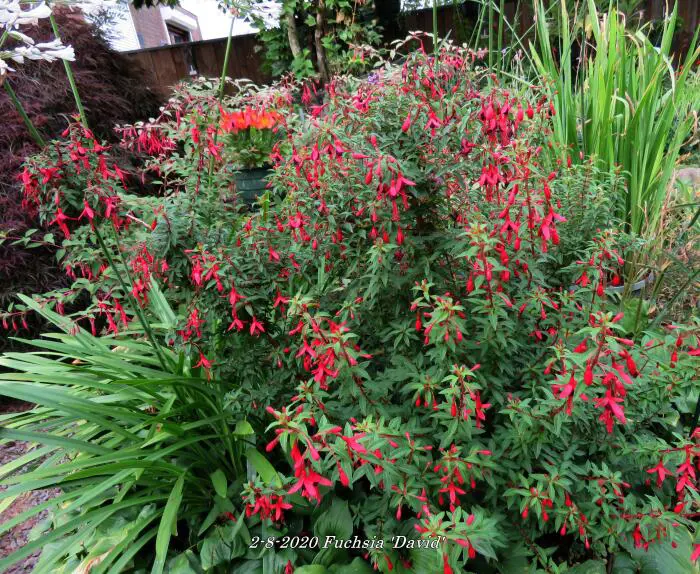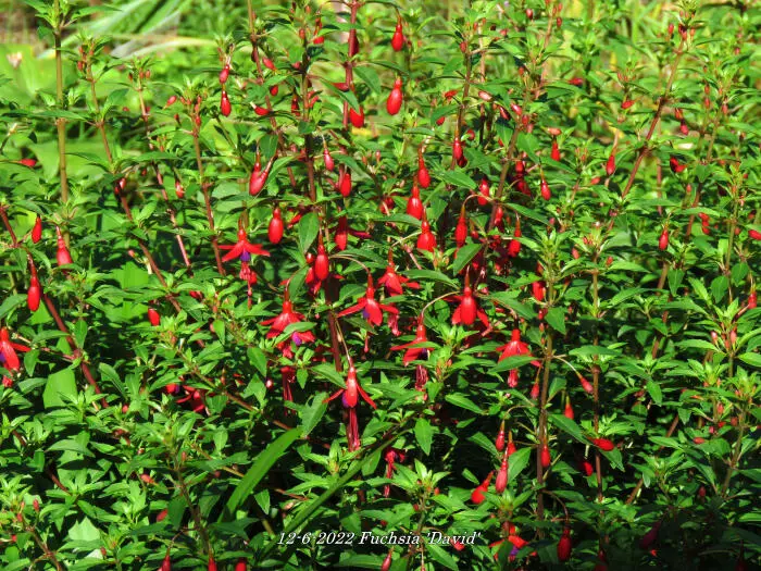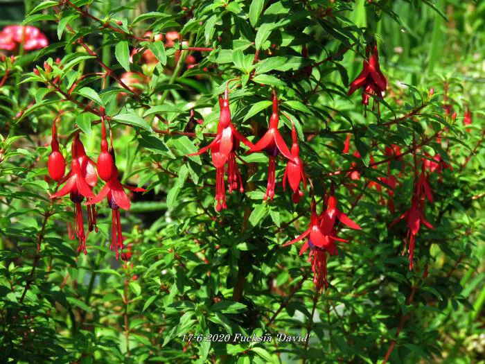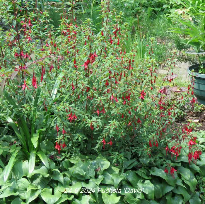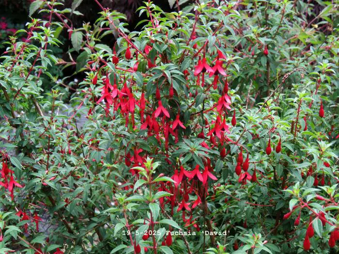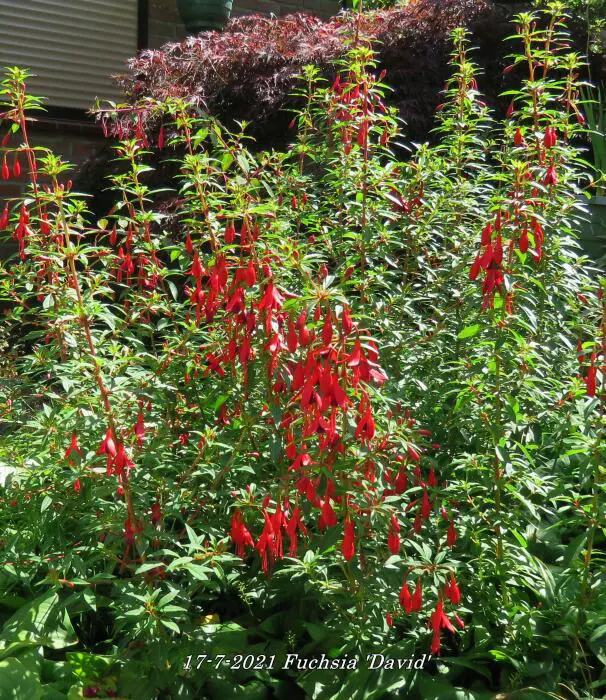 Fuchsia 'David' is een min of meer winterharde bellenplant met kleine bloemen en bladeren.