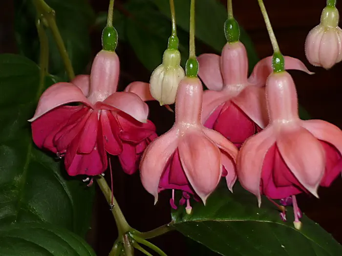 De bloemen hebben zalmroze kelkblaadjes en een magenta-oranje kroon.
