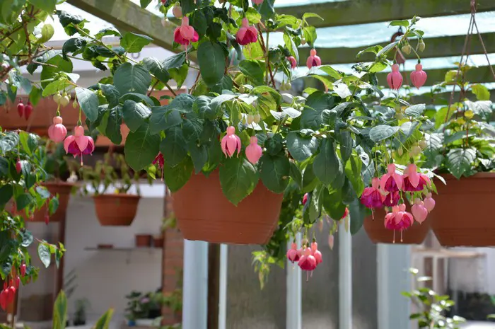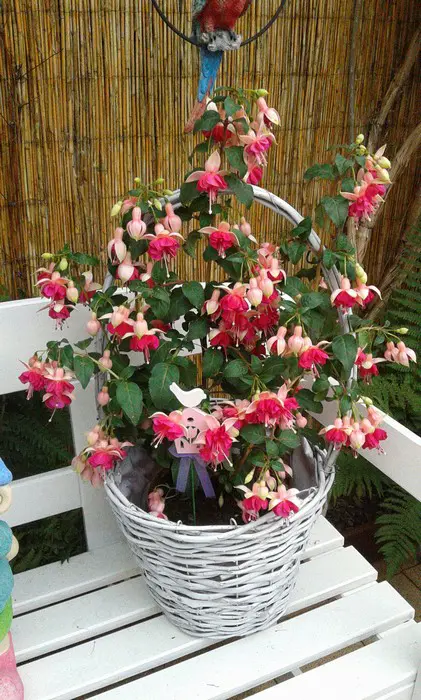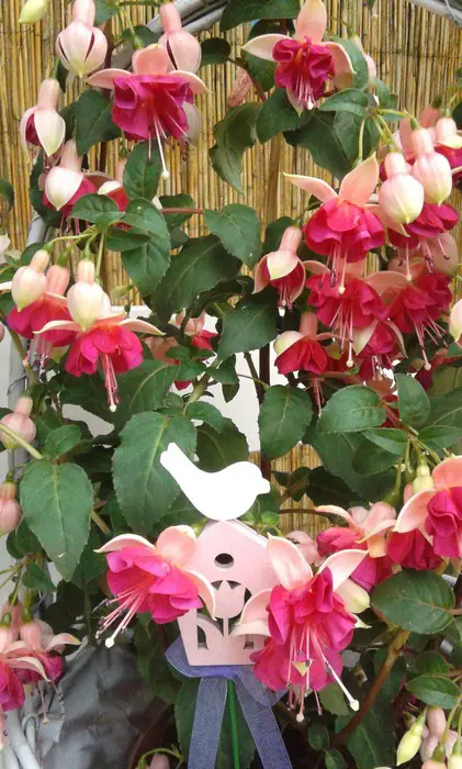 Fuchsia 'Garden News' is een grote bossige rechtop groeiende bellenplant met dubbele bloemen.