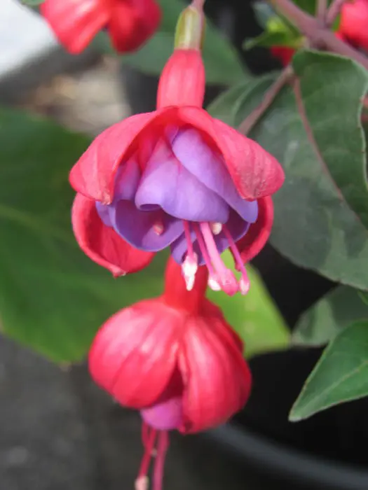 De bloemen hebben een karmijnrode kelk en een lilamauve kroon.