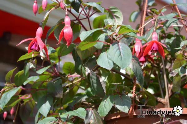 Fuchsia 'Kokarde' is een opgaand groeiende Fuchsia met enkelvoudige hangende klokjes.