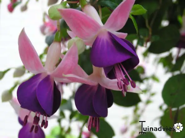 Fuchsia 'Lena' is een hangende fuchsia. Matig winterhard tot -7°C op een beschutte plek in de tuin.