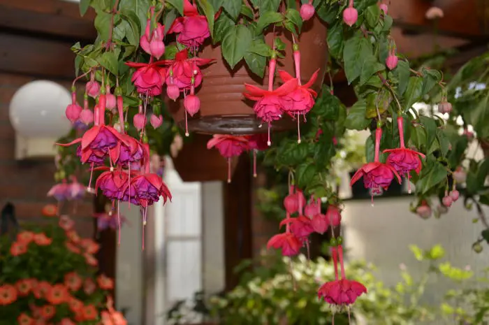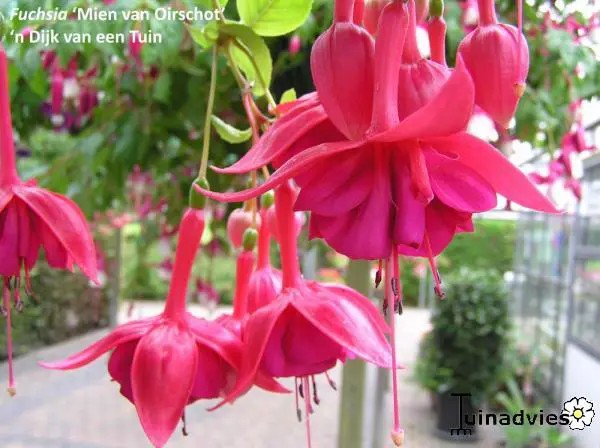 F. Mien Van Oirschot' is een hangplant die bloeit met dubbele klokvormige bloemen.