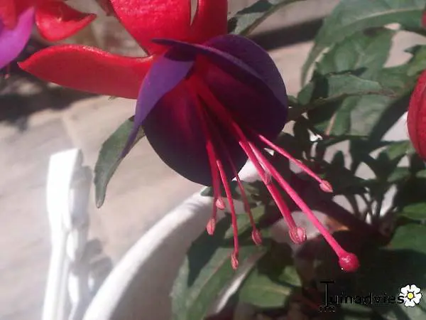 Fuchsia 'Pluto' is een kleinbloemige Fuchsia met paarsroze kroon en rozerode kelk.