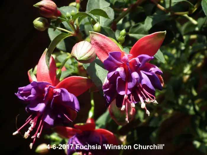 Fuchsia 'Winston Churchill' is een bossige opgaande bellenplant met dubbele bloemen.