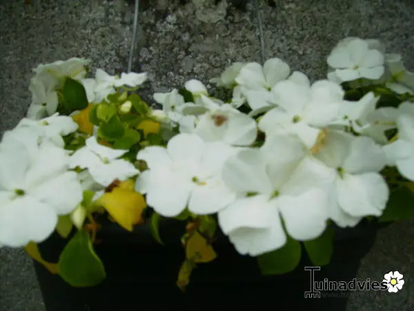 Impatiens walleriana 'FIESTA White' is een prachtige en vlijtige balkonplant dat ook in hangmanden tot zijn recht komt.