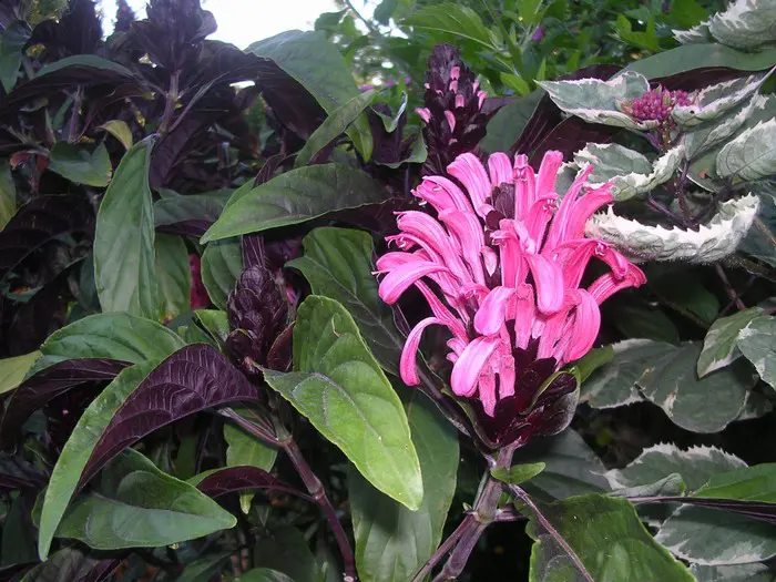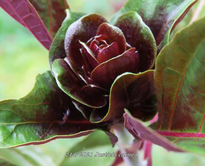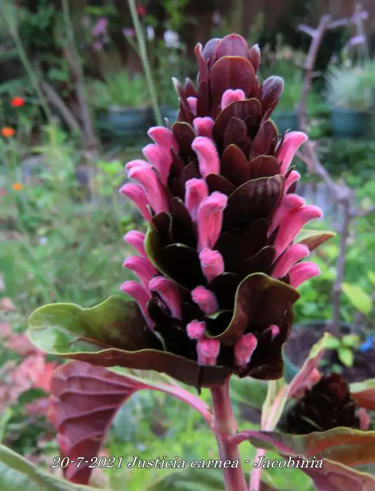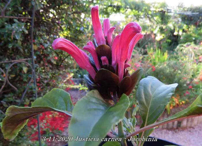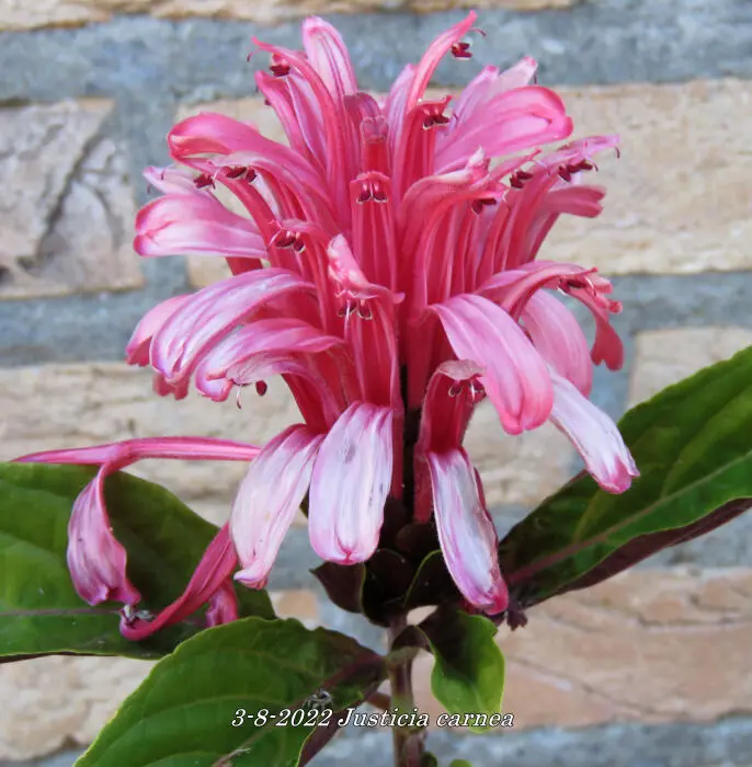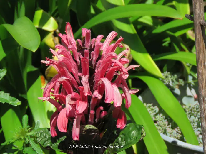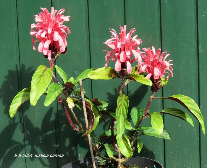 Justicia carnea heeft heel veel licht nodig en een hoge luchtvochtigheid.Ze bloeien met grote bloemen in licht roodpaars, vleeskleur of oranje.Het blad is groen en ruw behaard.De grond moet goed vochtig blijven maar droger in de winter.