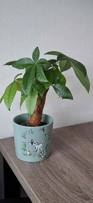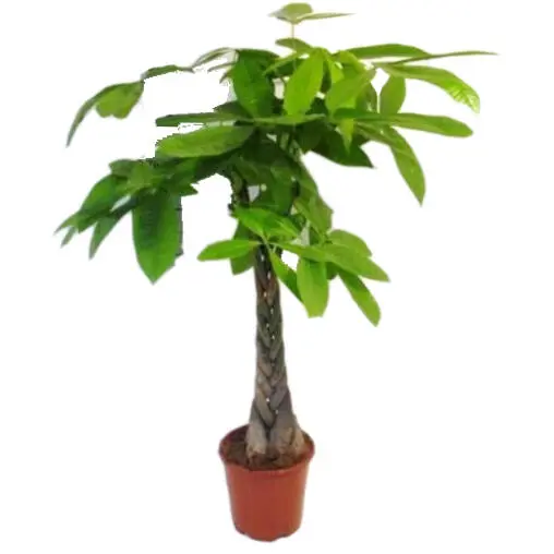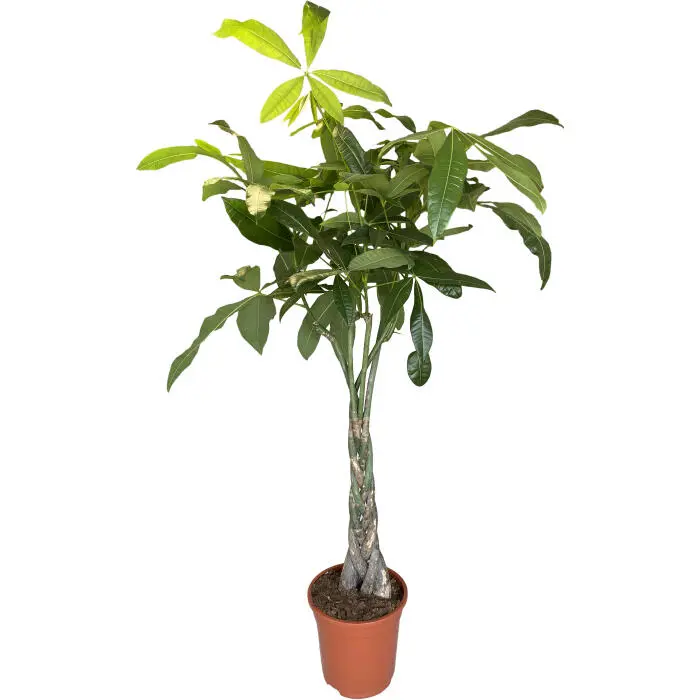 Pachira aquatica komt van oorsprong uit de moerassen van Centraal en Zuid-Amerika waar hij 20m hoog wordt en waar hij ook bloeit met gele bloemen. Helaas in onze woonkamer moeten we het stellen zonder bloei. Maar de plant heeft nog andere troeven om ons te bekoren. Door zijn soepele en buigzame stam worden deze vaak gevlochten wat de plant nog bijzonderder maakt.