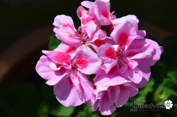 Pelargonium x hortorum 'Caroline' bloeit met enkelvoudige lichtroze bloemen met donkerroze in het centrum.