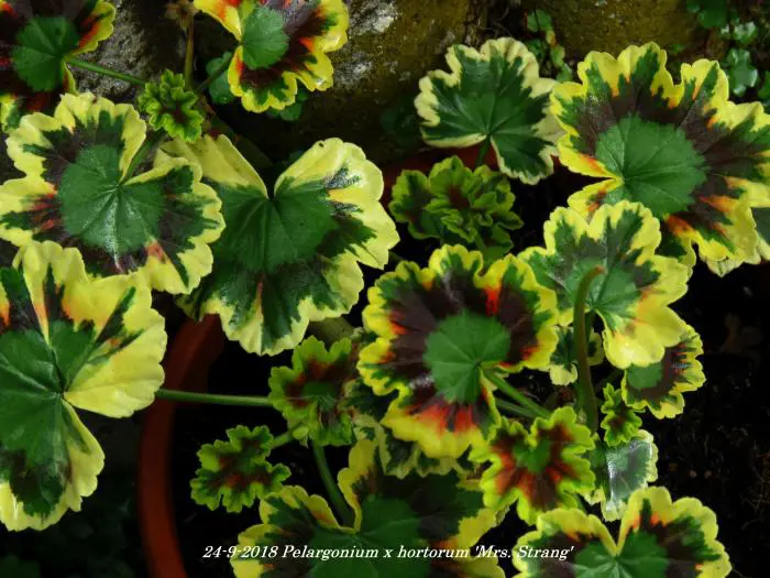 Pelargonium x hortorum 'Mrs. Strang' heeft opvallend bontgekleurde bladeren, blauwgroen, roodbruin en strogeel.