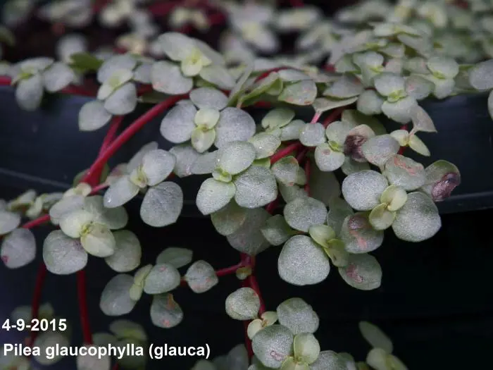 Pilea glaucophylla is een tropische plant met zeer aantrekkelijke, kleine zilvergroene blaadjes aan vlezige rode stengels.
