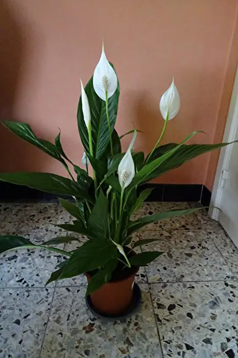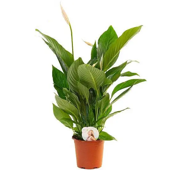 De bloeikolf van Spathiphyllum wordt door een witte bloeischede omschulpt. De lang gesteelde bloemhoofden torenen boven de talrijke, ranke bladeren uit.