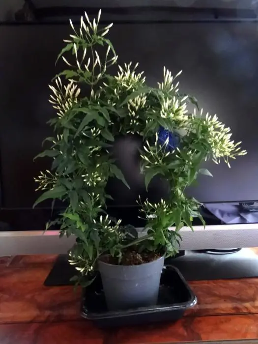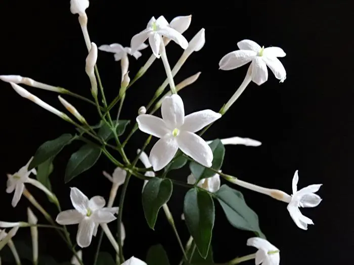Een rijkbloeiende en groenblijvende klimheester met donkergroene glimmende blaadjes en wit geurende bloemschermen.