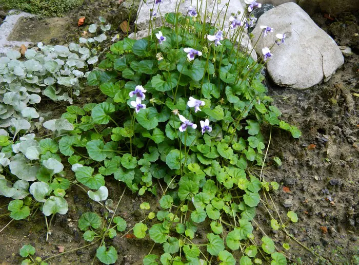 Viola hederacea is een rotsplantje met kleine niervormige blaadjes.