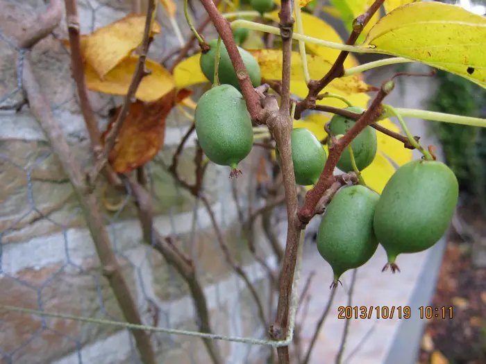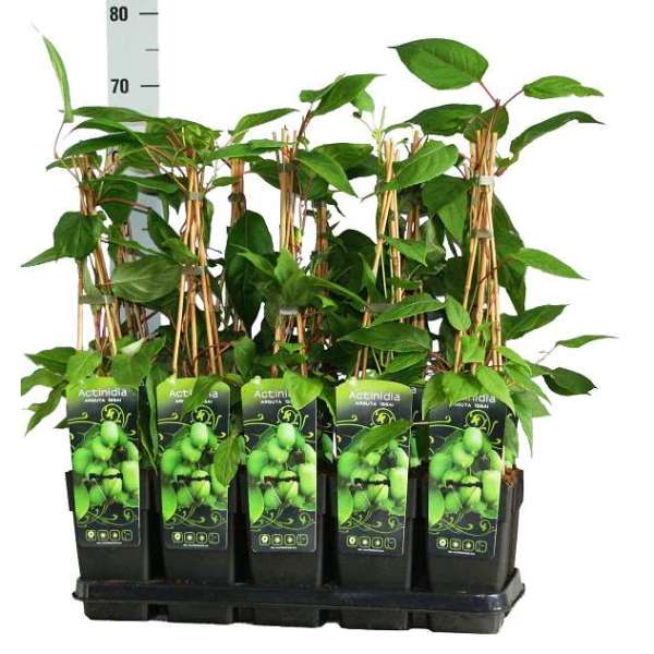 De haarloze kleine kiwivruchten zijn rijp en eetbaar vanaf september, worden veelal smakelijker gevonden dan deliciosarassen en hebben meer vitamine c per gram. Ze geven al het eerste of tweede jaar reeds vruchten.