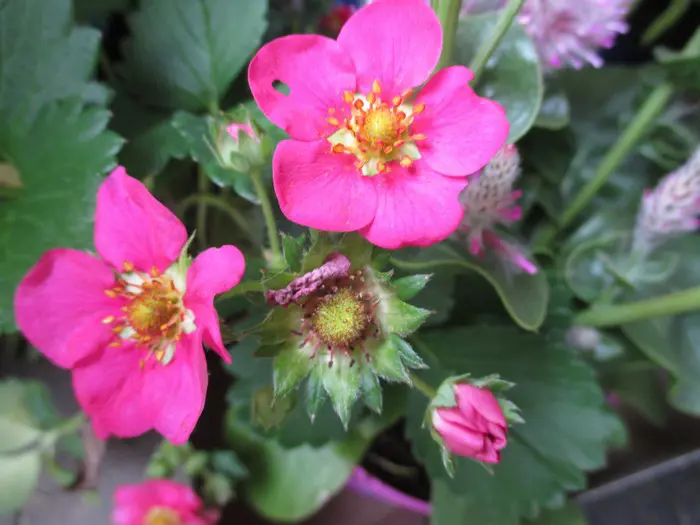 Een kleine, niet eetbare sieraardbei met fel rode bloempjes.