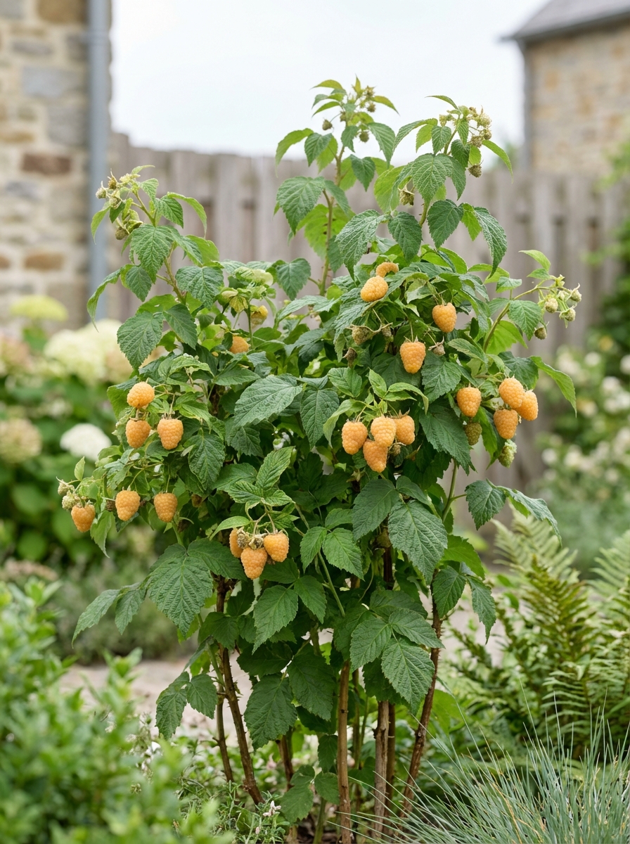 Rubus idaeus Twotimer 'Sugana Yellow' produceert 2 maal per jaar gele frambozen, in de zomer op het oud hout en later in de herfst op het nieuw oud. Het is een compacte rechte struik met weinig zijtakken.