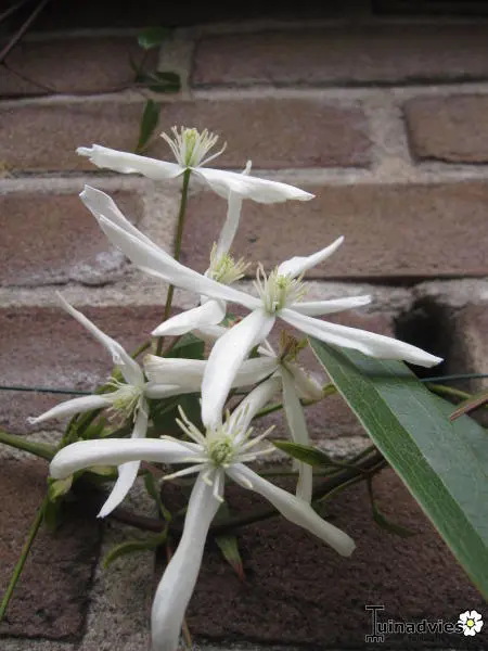 Clematis armandii 'Snowdrift' is een wintergroene vroegbloeiende Clematis met trossen van witte bloempjes soms met een roze tint. Ze geuren licht naar vanille.