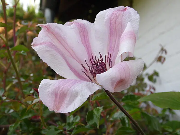 Een grootbloemige Patens clematis waarvan de eerste bloei wit is met een donkerroze streep en rozerode meeldraden, de tweede bloei is bijna volledig wit.