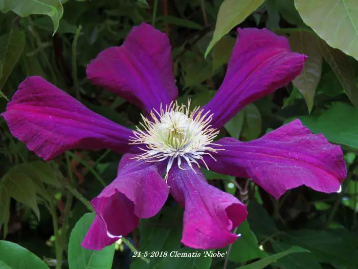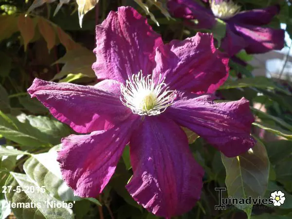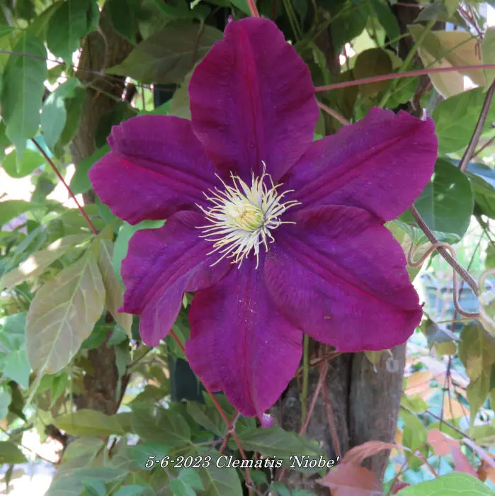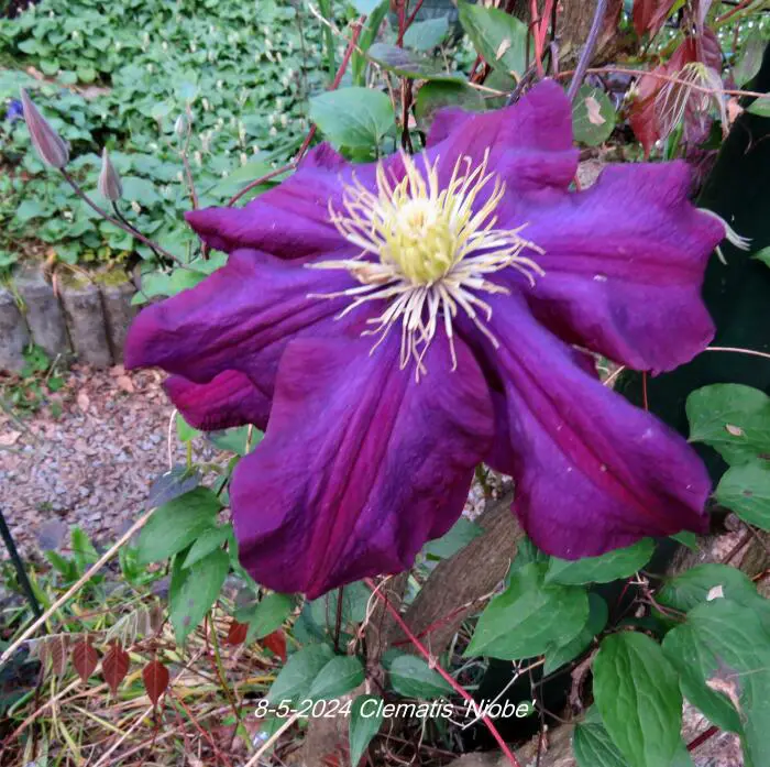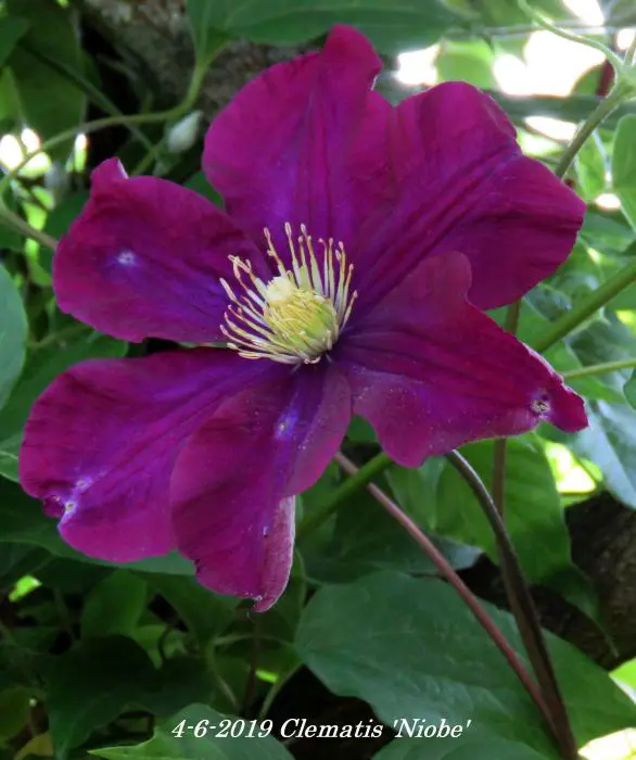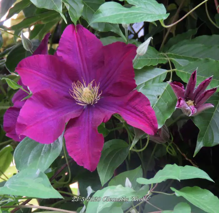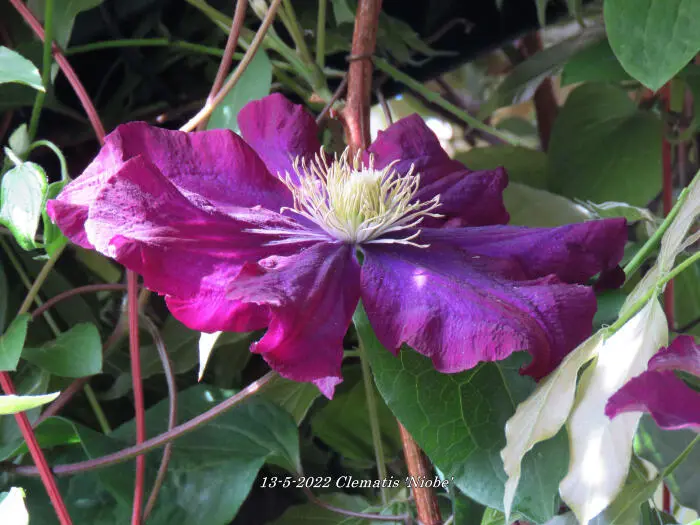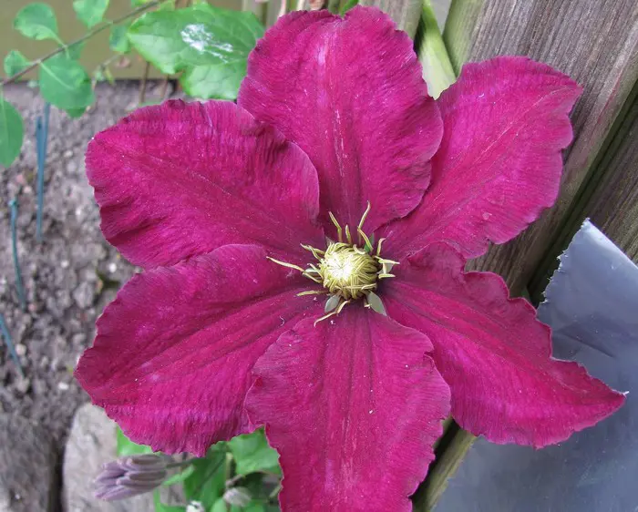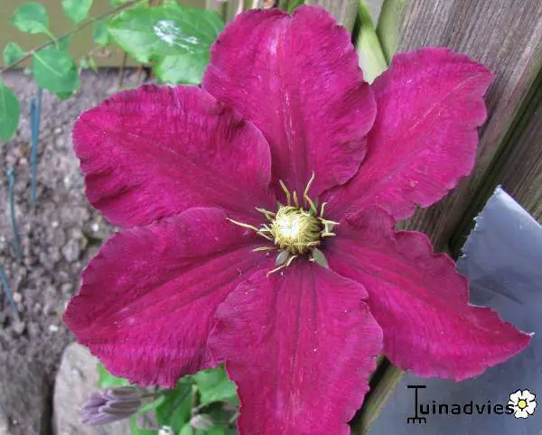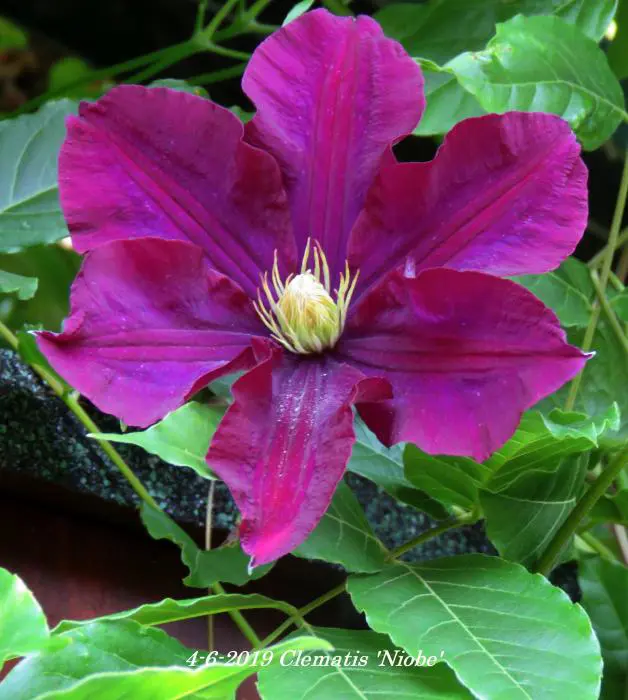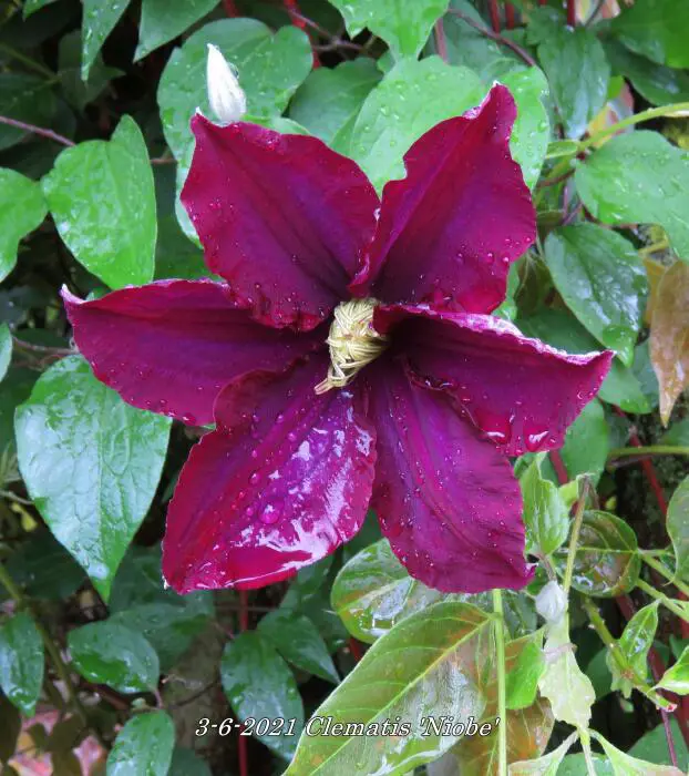 Een grootbloemige hybride uit de jackmanii-groep met fluweel donkerrode bloem en gele meeldraden.