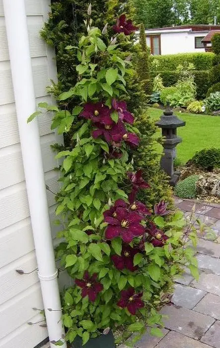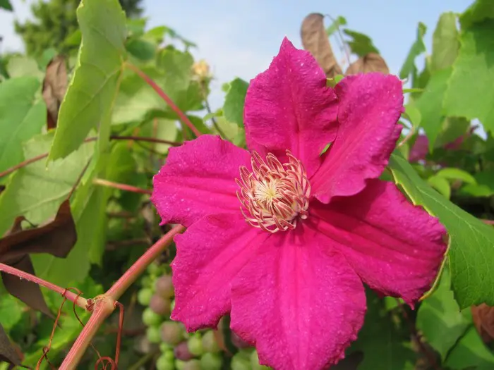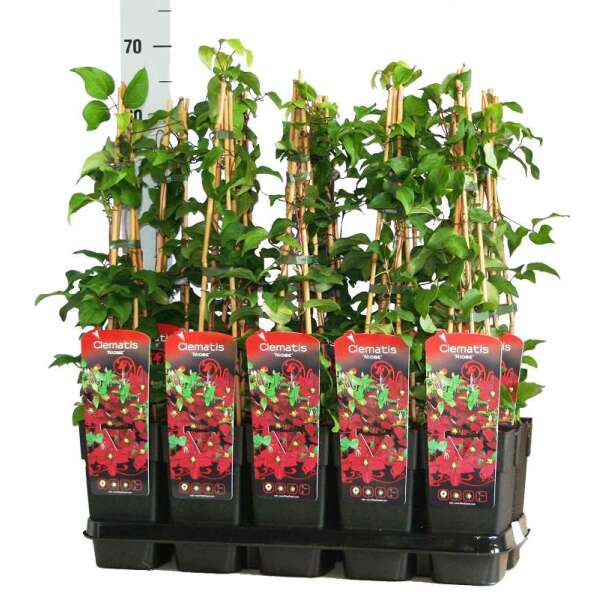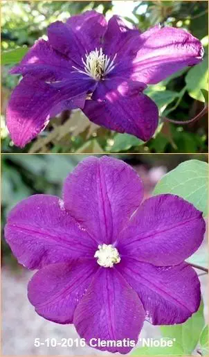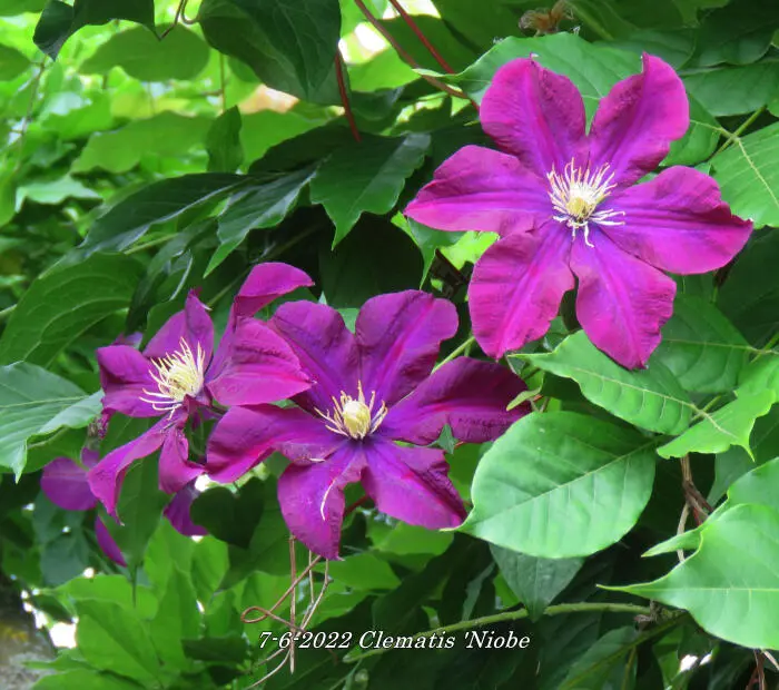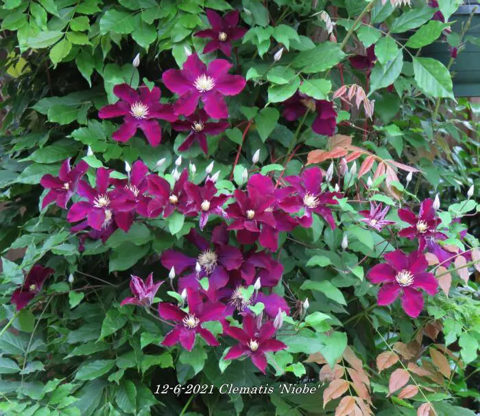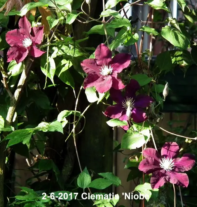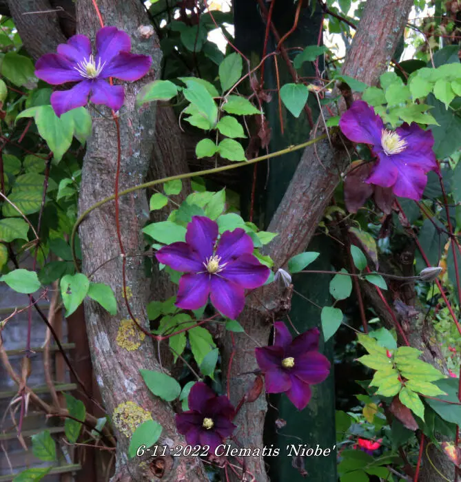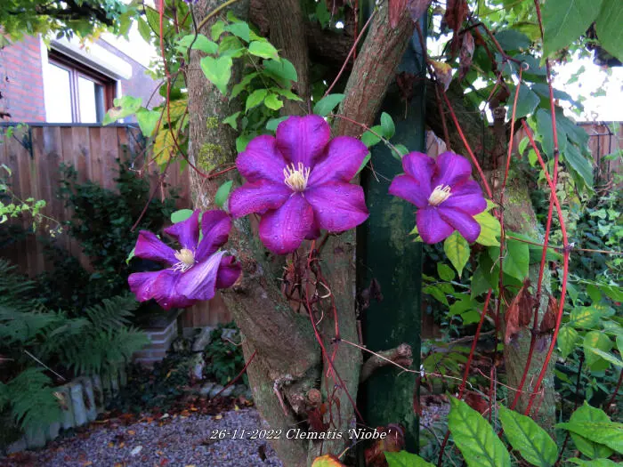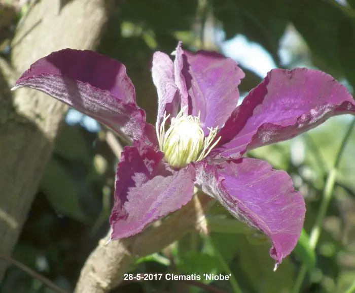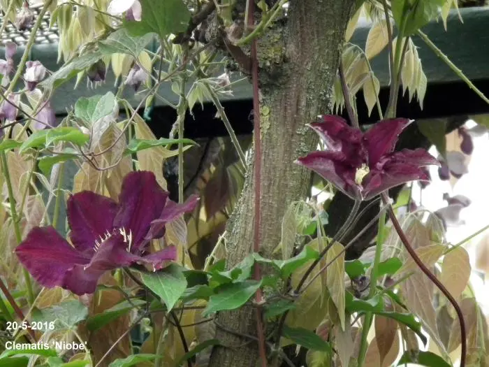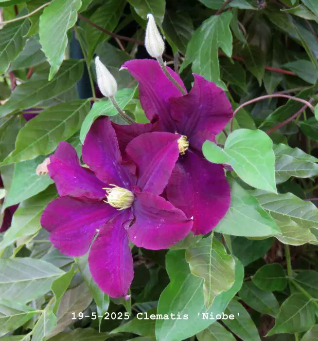Een grootbloemige hybride uit de jackmanii-groep met fluweel donkerrode bloem en gele meeldraden.