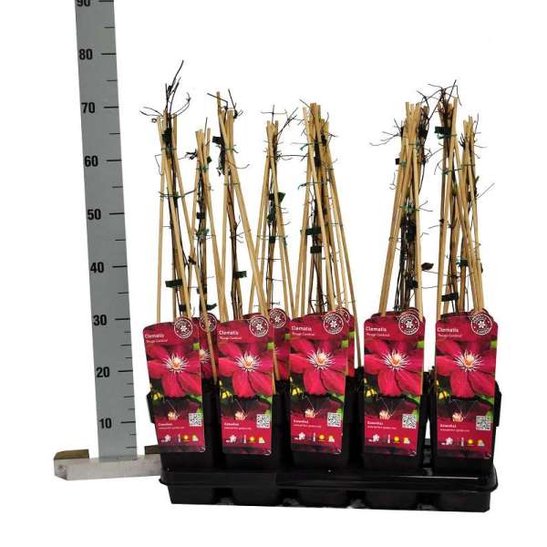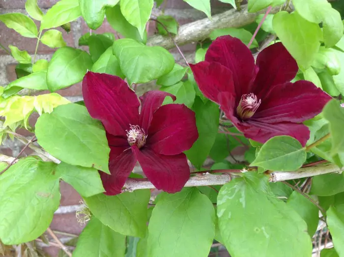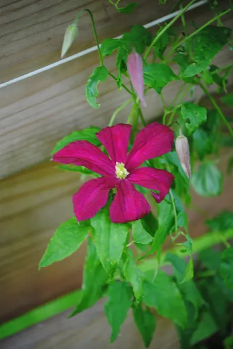 Een grootbloemige clematis met een velvetrode kleur.
