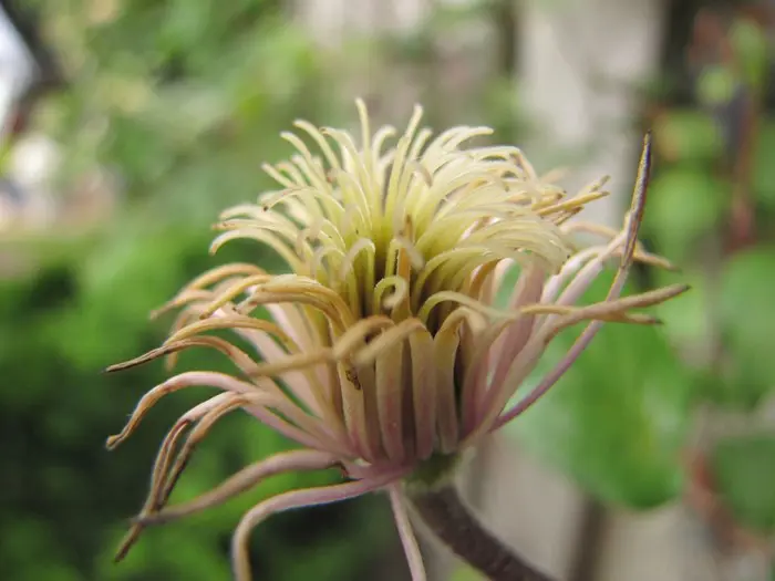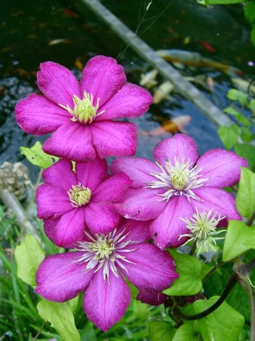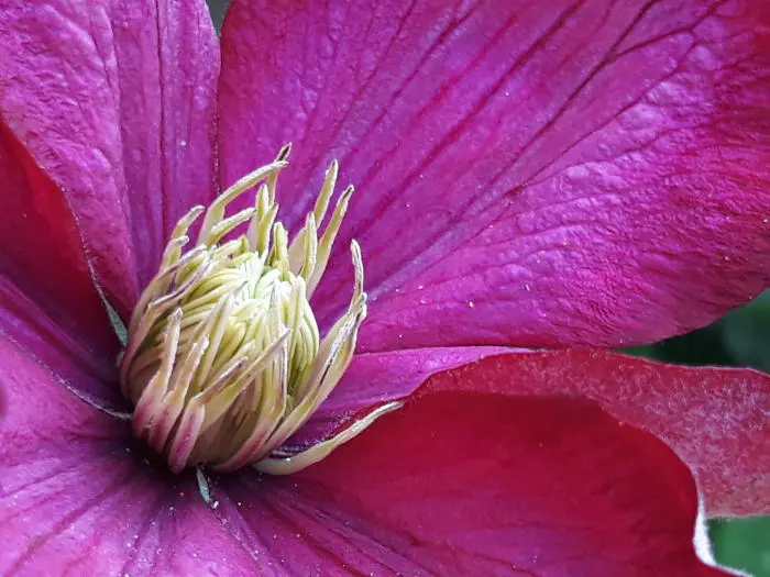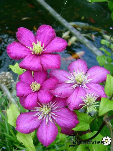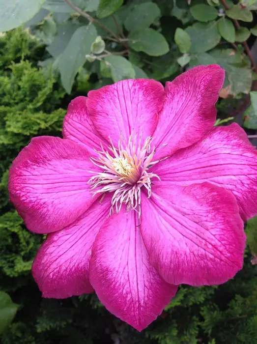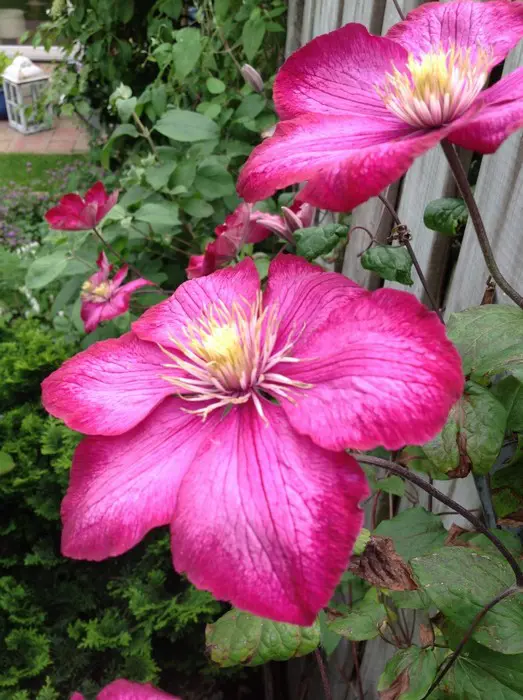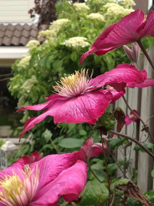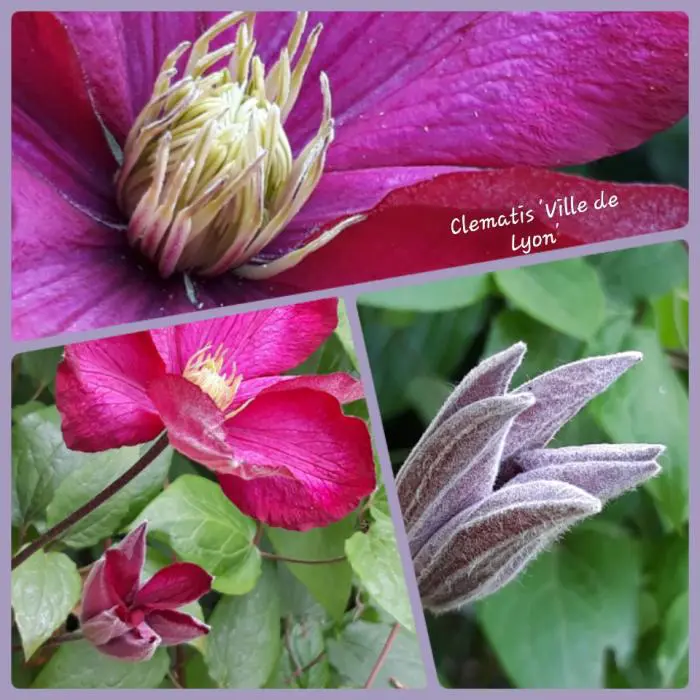 Clematis ´Ville de Lyon´ bloeit met grote donker karmijnrode bloemen.