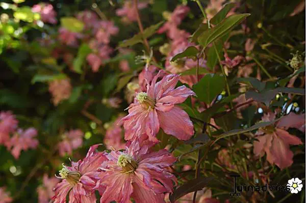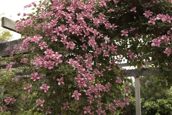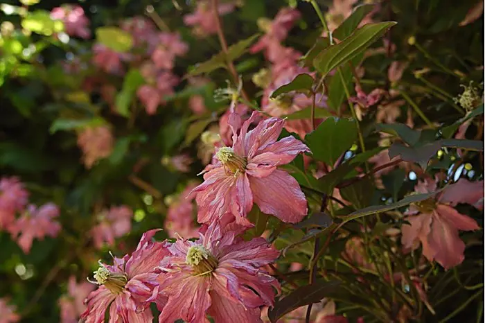 Clematis montana 'Broughton Star' is een rijkbloeiende bosrank met kleine semidubbele bloemen, soms volledig dubbel.