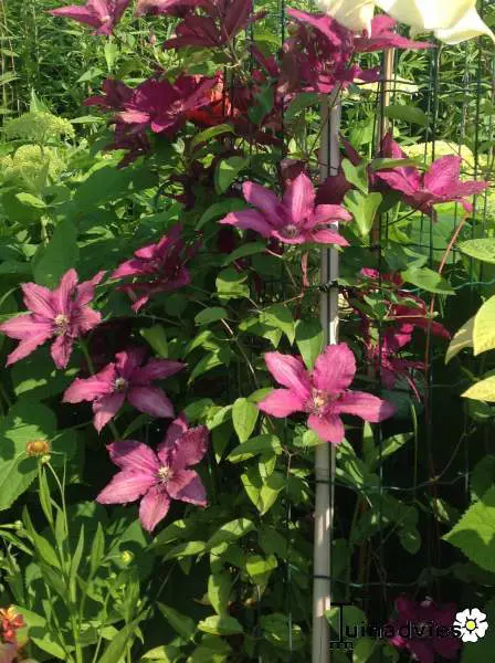 Bloeit met grote, donker rode bloemen uit de Patens-groep en wordt 2 tot 3m hoog.