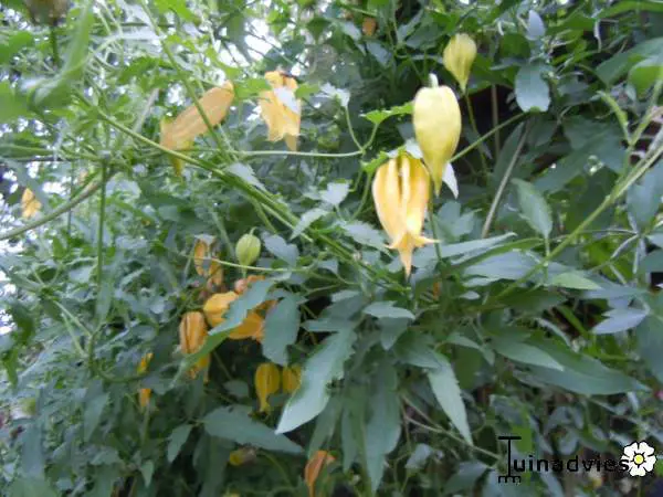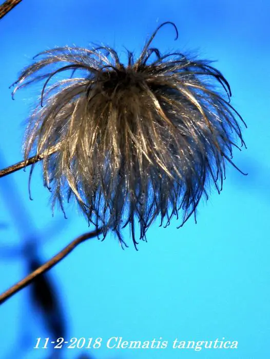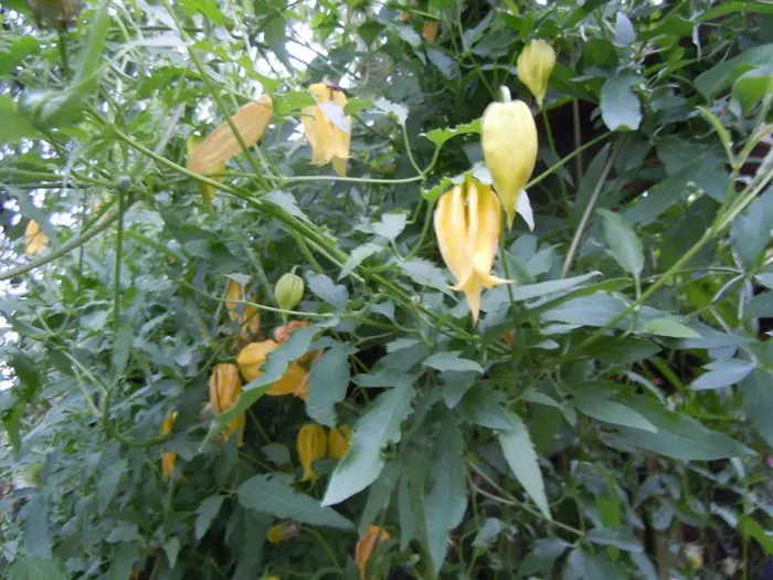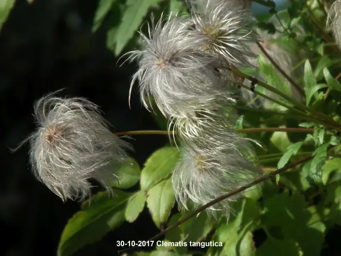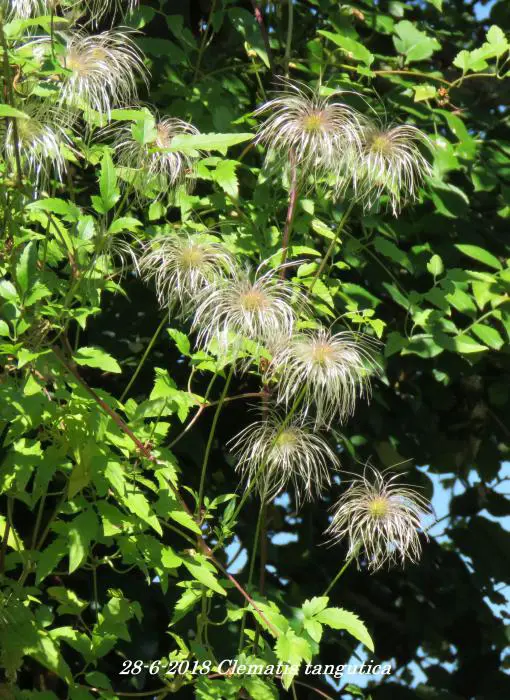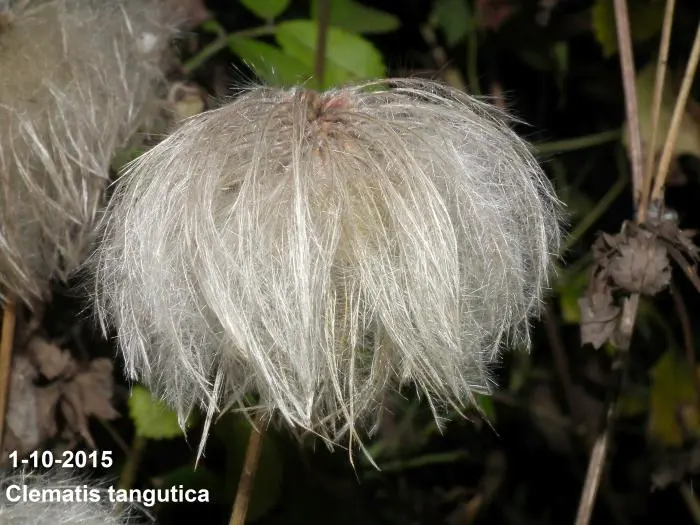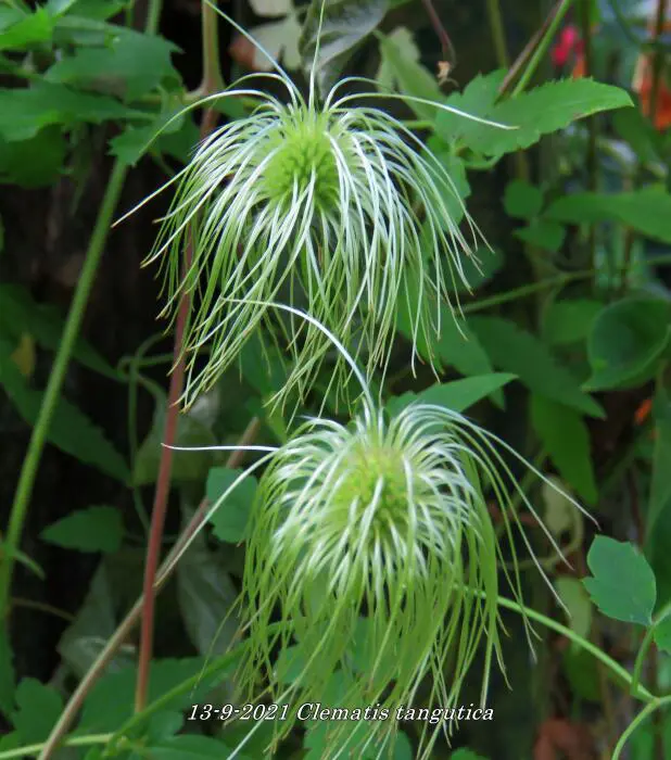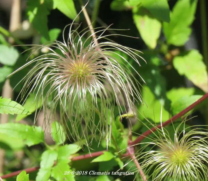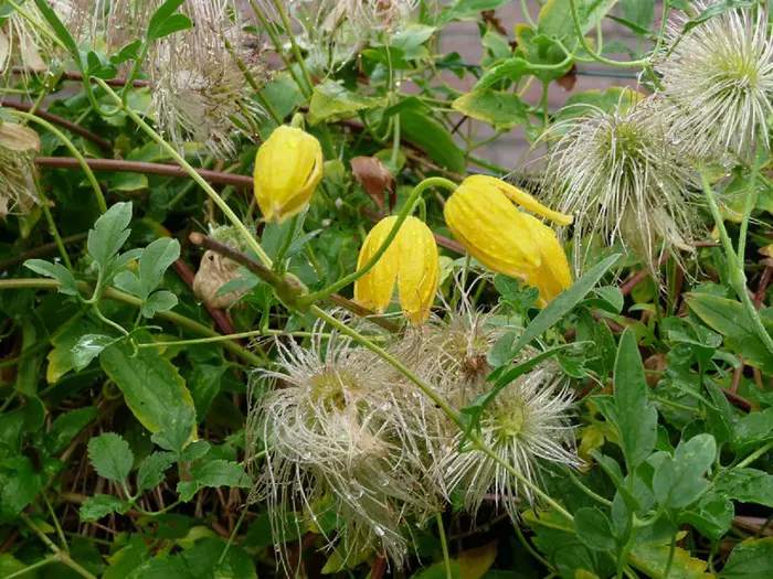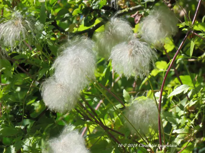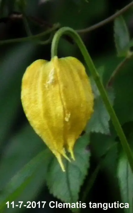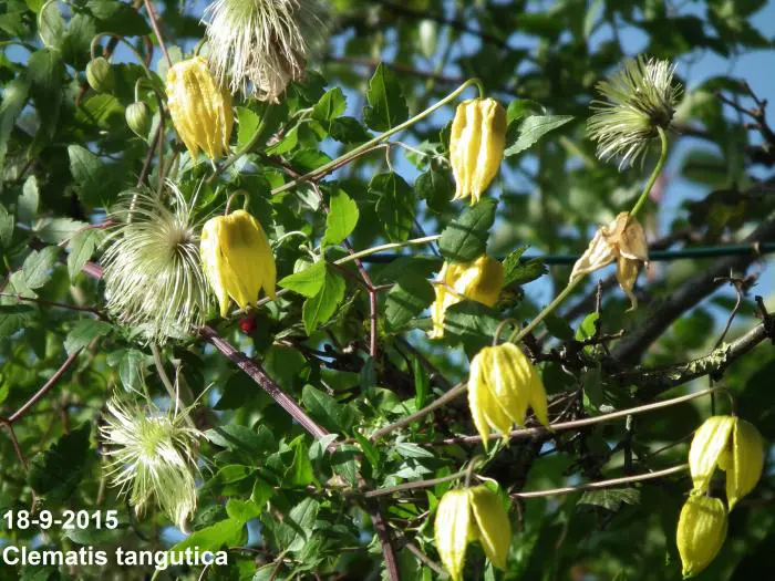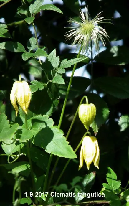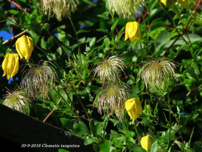 Clematis tangutica bloeit met hangende lantaarnvormige bloemen gevolgd door mooie zaadpluizen.