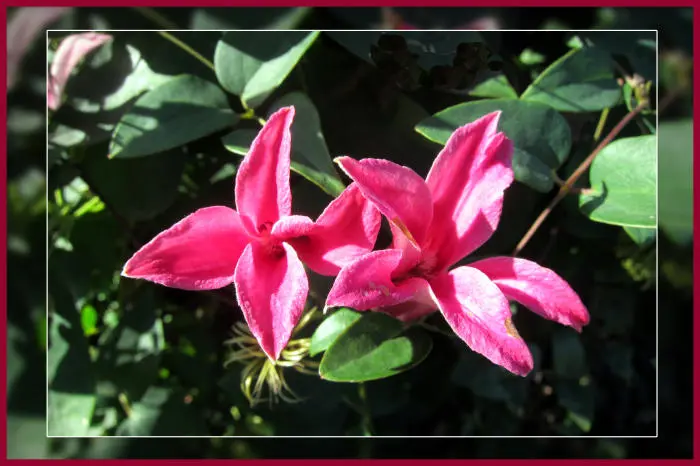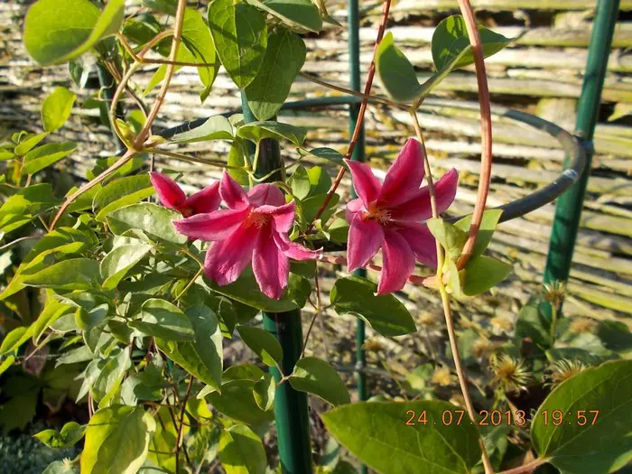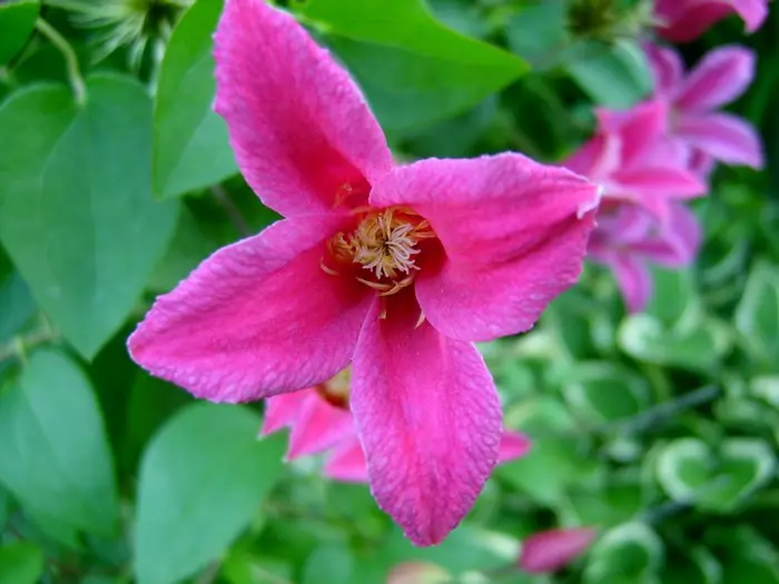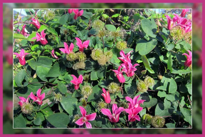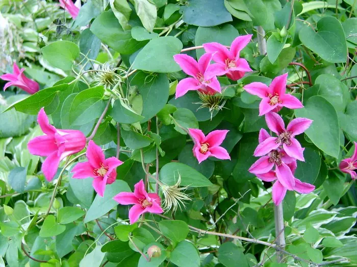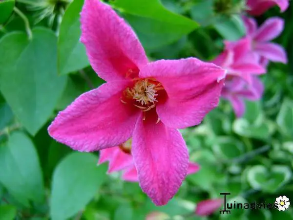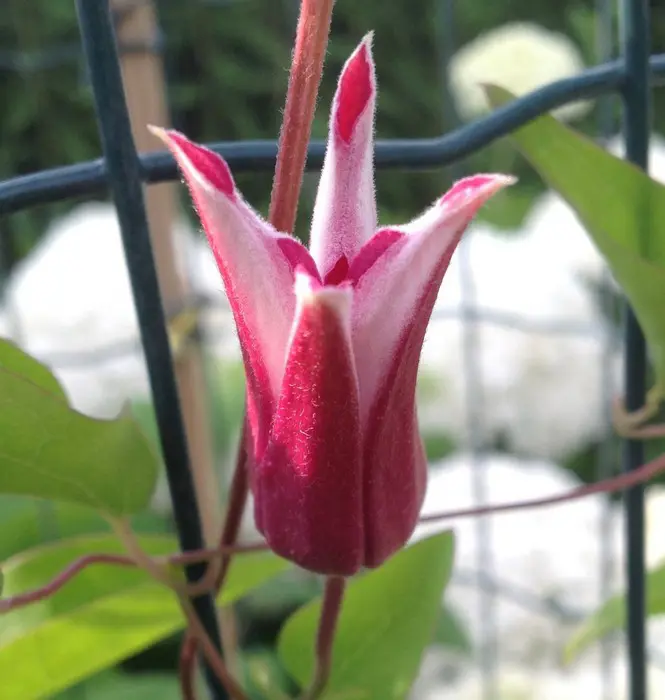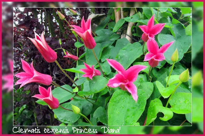 Clematis texensis ´Princess Diana´ bloeit met tulpachtige felroze bloemen en hebben een opvallende middenstreep op de bloemblaadjes.