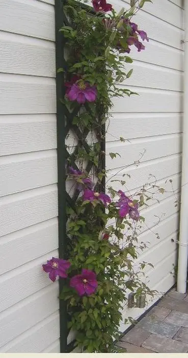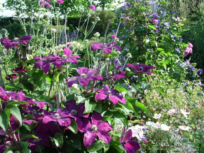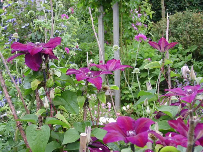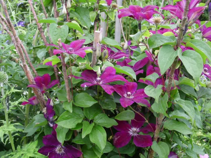 Het zijn vroege grootbloemige Clematissen die op het oude hout bloeien.