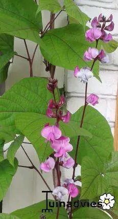 Het is een snelgroeiende klimmer met paarsroze bloemen gevolgd door even mooie paarse peulen.