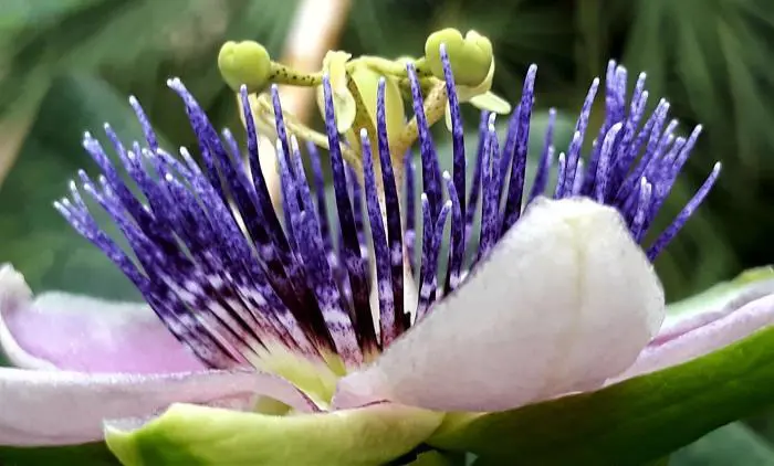 De bloem heeft witte kelkbladeren en kroonbladeren en een paarsblauwe corona.