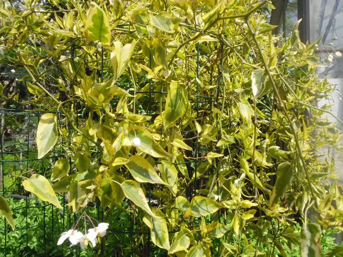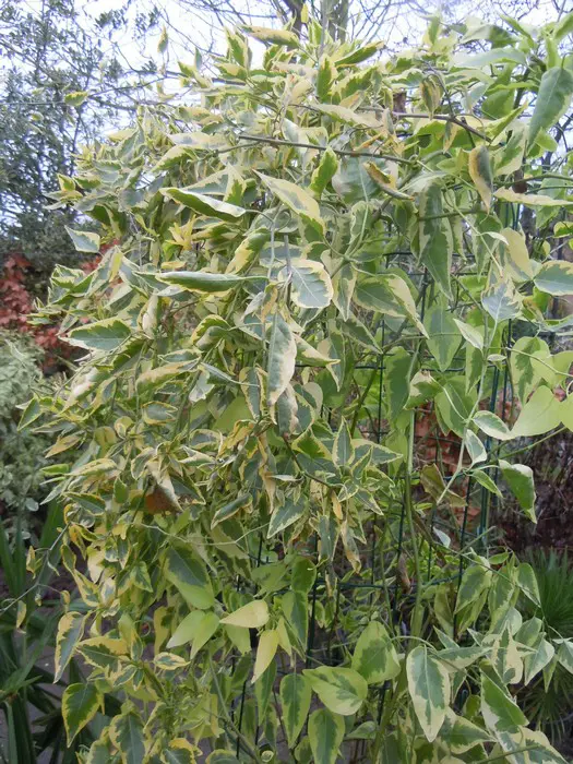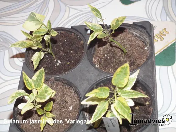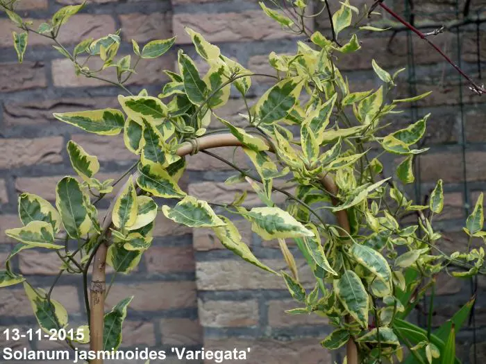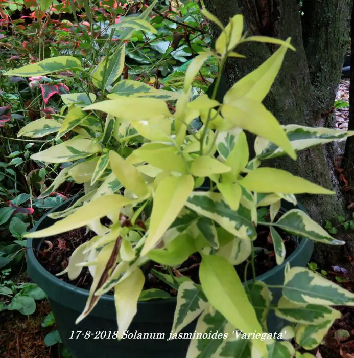 Solanum jasminoides 'Variegata' is een bontkleurige klimmende nachtschade met groen/cremewitte bladeren.