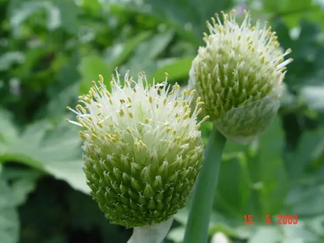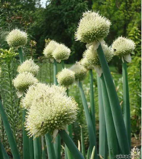 Allium fistulosum is een waardevolle aromatische sierui voor de border en rotstuin met bloemschermen van kleine groenwtte bloempjes.