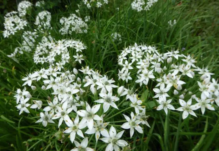 Een nieuwkomer op de markt is het chinese bieslook bloeiend met schermen van kleine lieve stervormige bloempjes en grassprietachtige blaadjes.