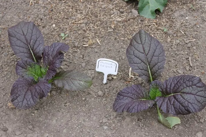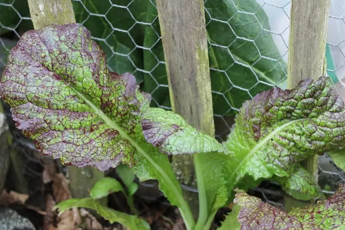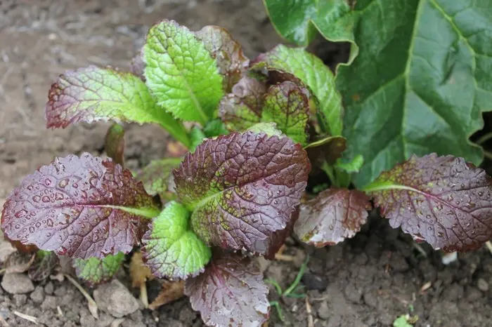 Brassica juncea 'Red Giant' heeft donker roodgroene bladeren.