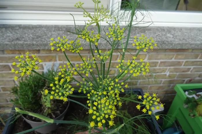 Uit de knol groeien krachtige loten met mooi fijn gevederd blad en gele schermbloemen.